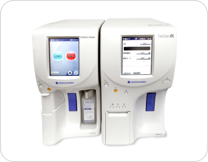 2013年10月より全自動血球計測器と臨床化学分析装置を導入しました。今まで検査施設に委託していたため結果が出るまで数日かかっていましたが、白血球・赤血球・血小板および炎症反応(CRP)のデータが5~6分で患者さんにお伝えできるようになりました。